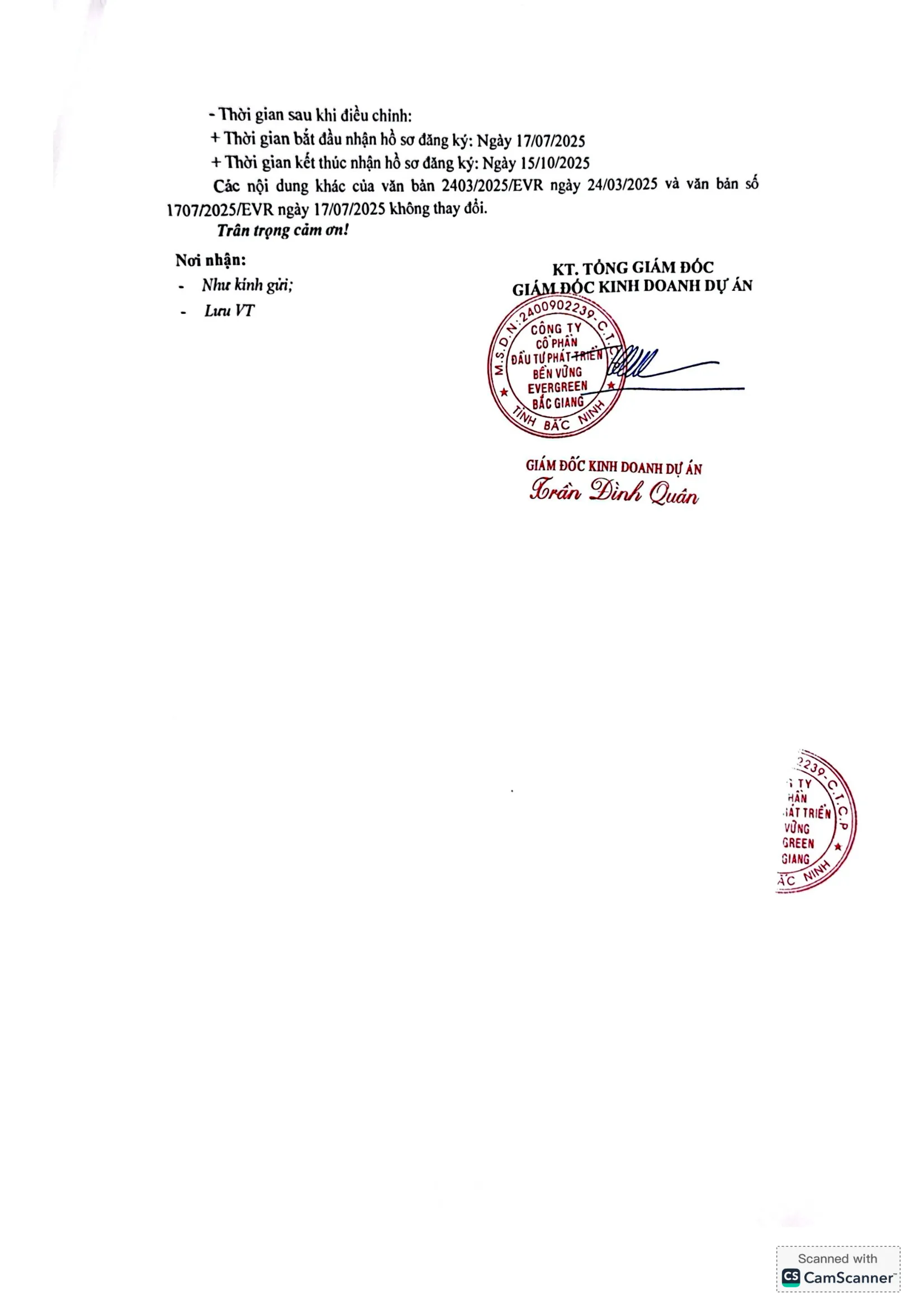 Công văn điều chỉnh thời gian tiếp nhận hồ sơ lô CT3, CT4